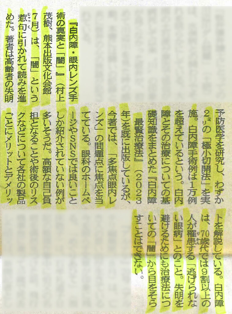 村上院長の著書『白内障・眼内レンズ手術の真実と「闇(やみ)」』(創流出版)が熊本日日新聞朝刊にて著書の内容が分かり易く広く紹介されました。