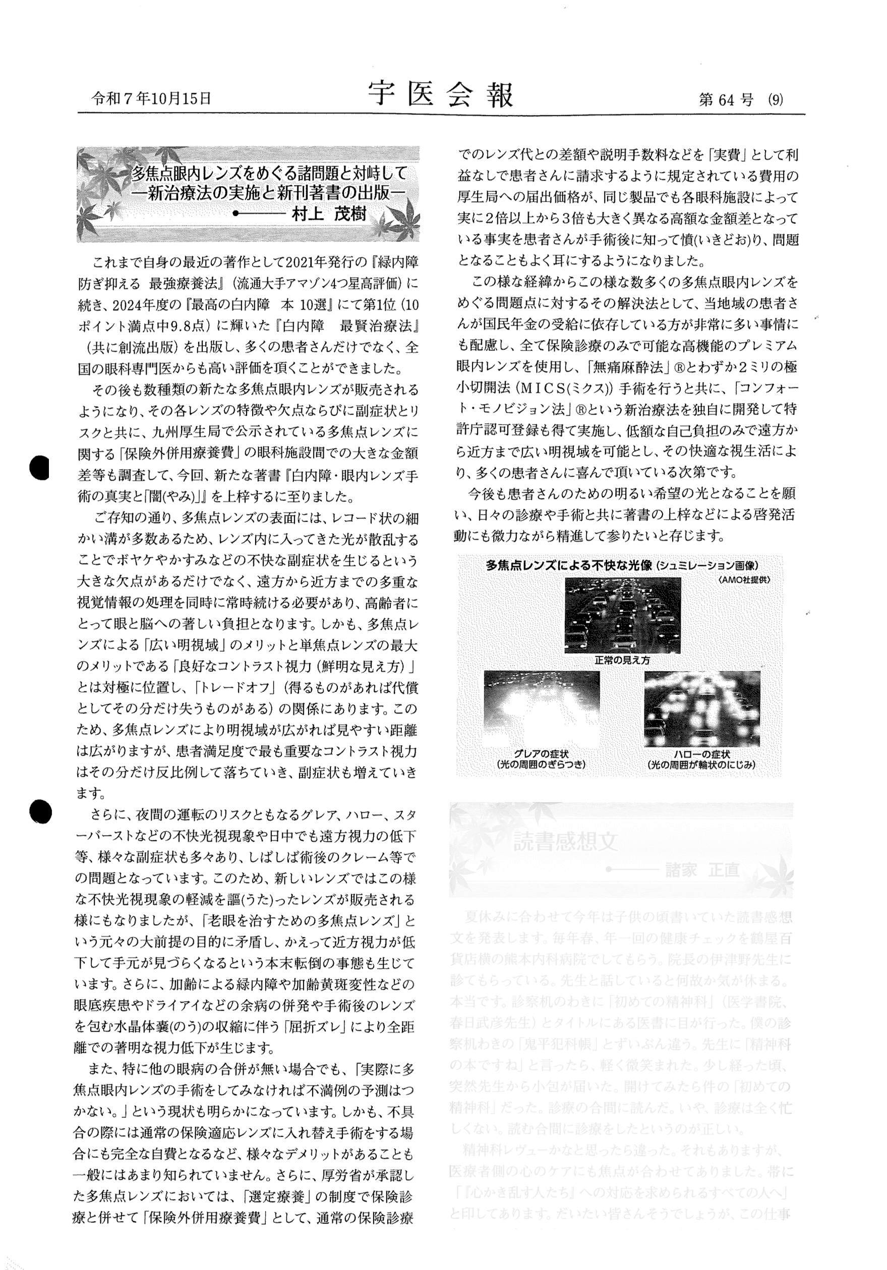 宇医会報2025年10月15日号に院長の記事【多焦点眼内レンズをめぐる諸問題と対峙して-新治療法の実施と新刊著書の出版-】が掲載されました。
